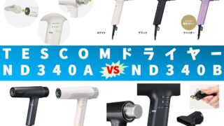 TESCOMのヘアドライヤーND340AとND340B。2製品の違いについて、5つの特性(基本情報/サイズ・重量/温風温度/消費電力/機能・使いやすさ)別に詳しく比較しました。ヘアドライヤーの購入を検討中の方の参考になれば、幸いです。