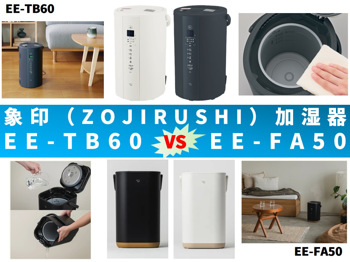 象印(ZPJIRUSHI)の加湿器、EE-TB60とEE-FA50の違いを、6つの特性(基本情報/加湿能力/使いやすさ(機能)/サイズ・重量/電気代/安全面)別で詳しく比較紹介させていただきました。