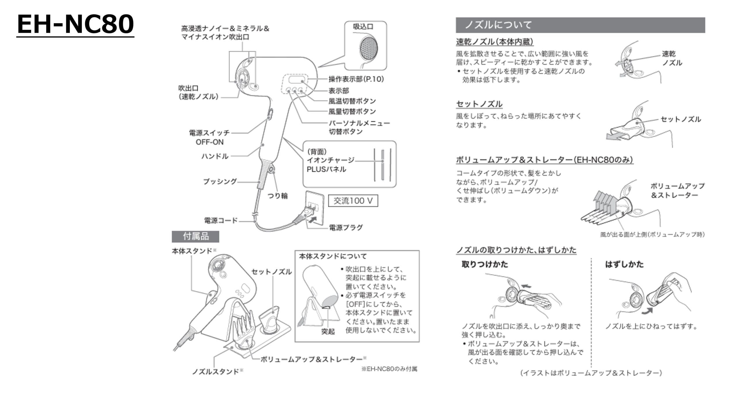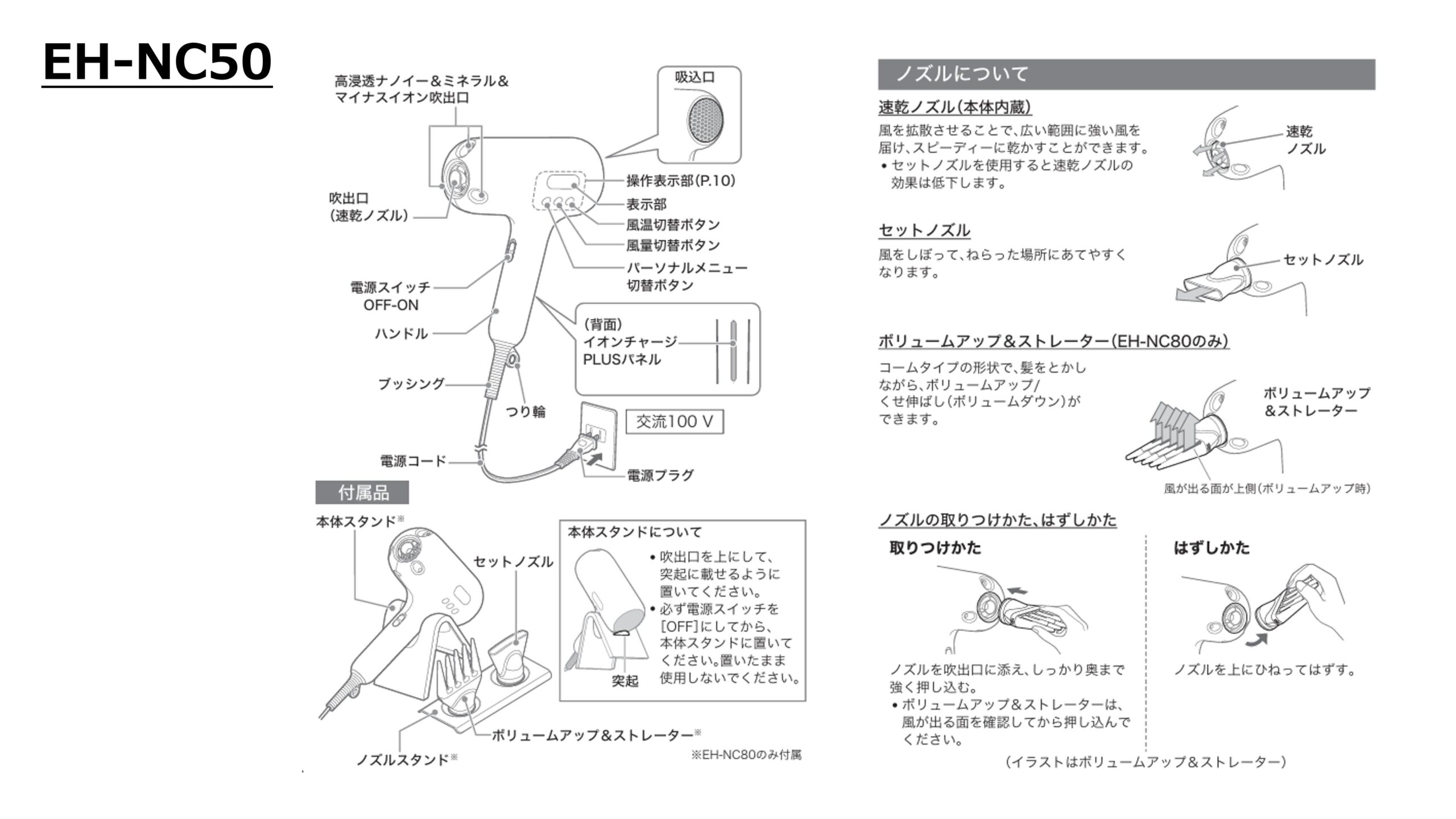 - 付属品の充実度 EH-NC50:基本ノズルのみ、EH-NC80:スタイリングノズル+スタンドなど多数