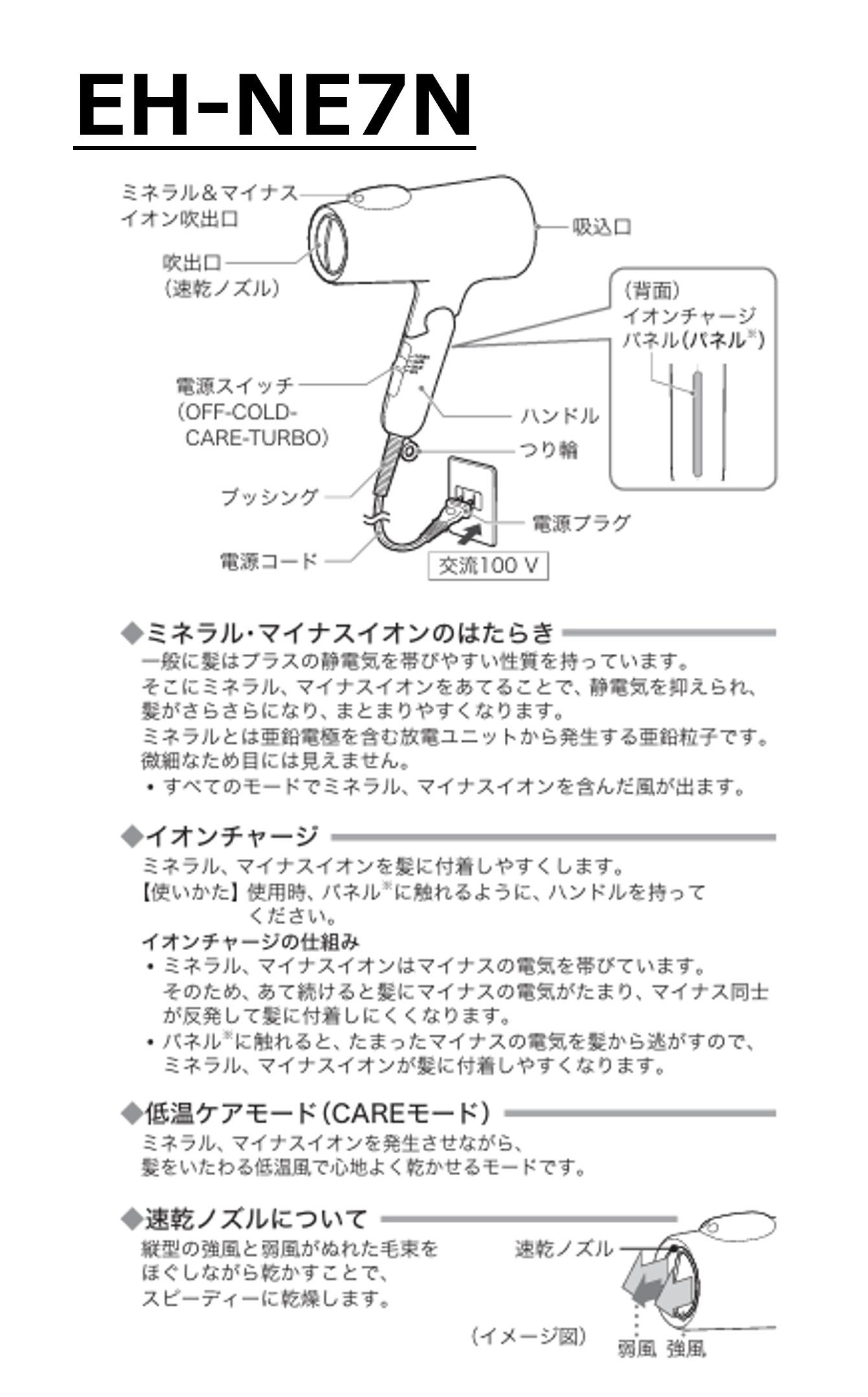 - ヘアケア機能 EH-NE7N:ダブルミネラル+低温ケアモード、EH-NA2K:ナノイー
