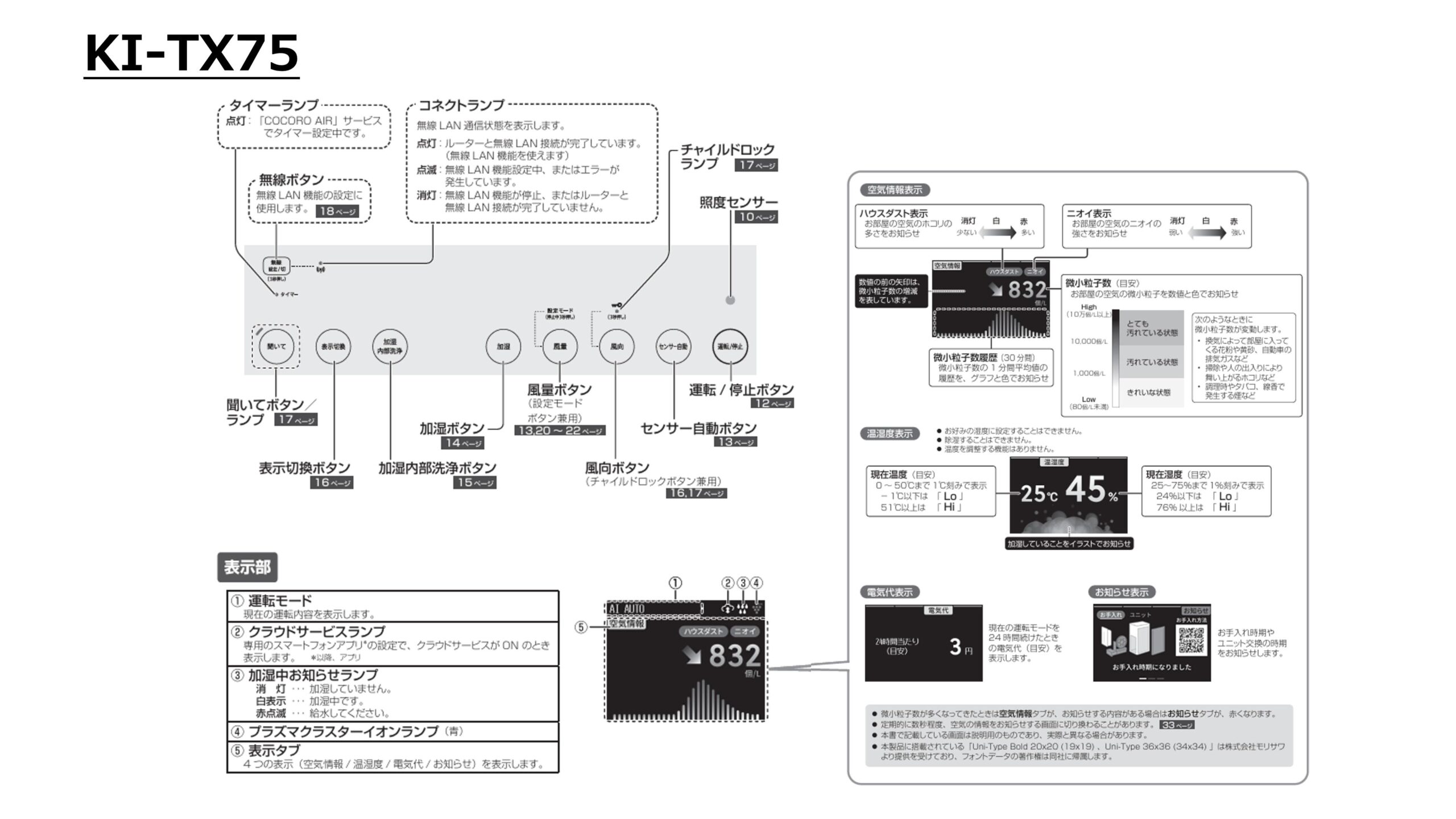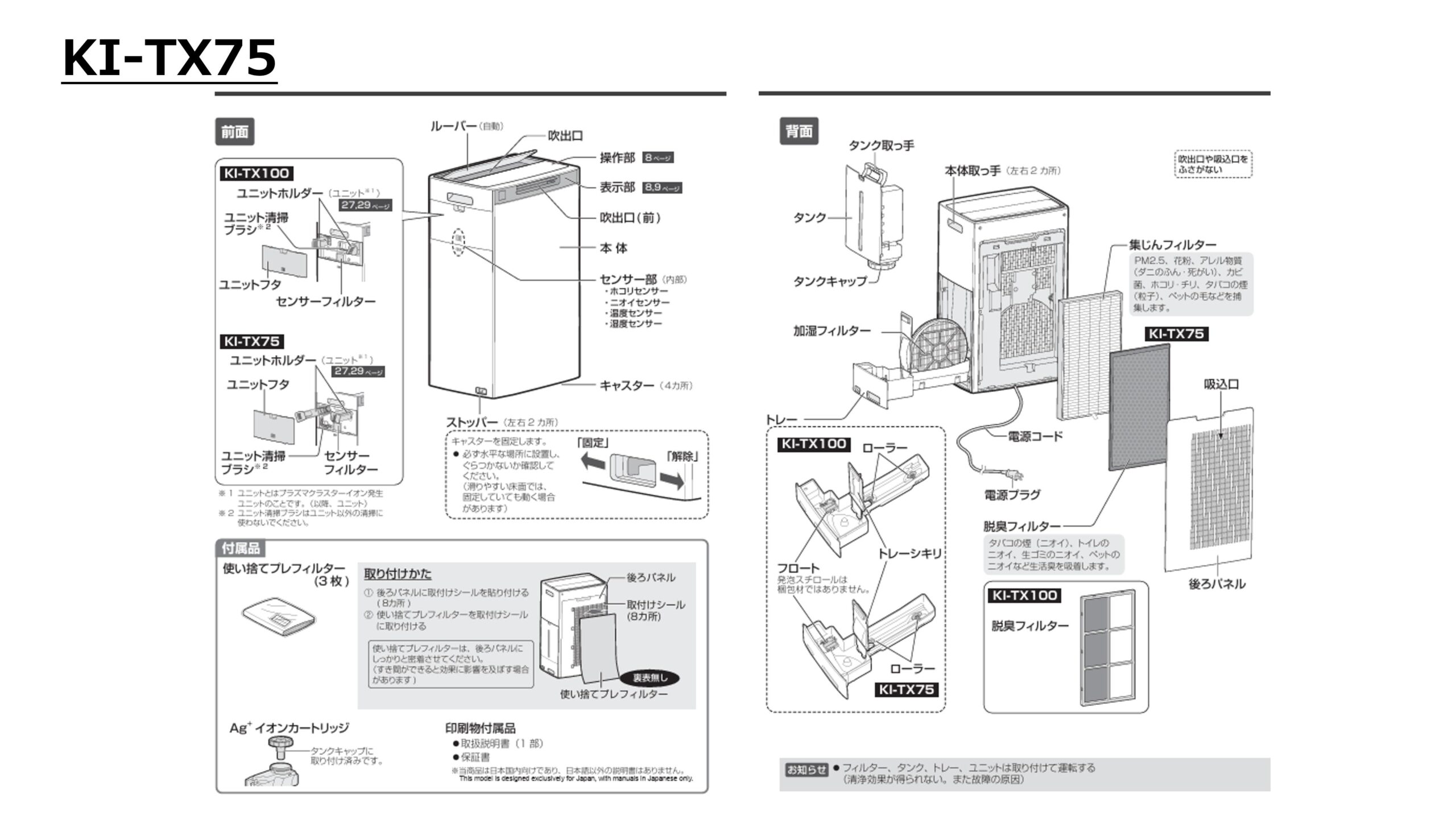 - 電気代(空気清浄 強) KI-SX75:約2.5円、KI-TX75:約2.4円