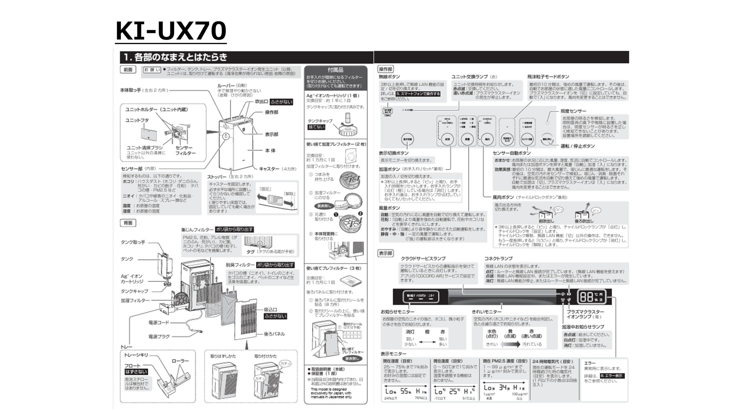 - 加湿空気清浄(静音)消費電力 KI-TX70:7.2W、KI-UX70:7.0W