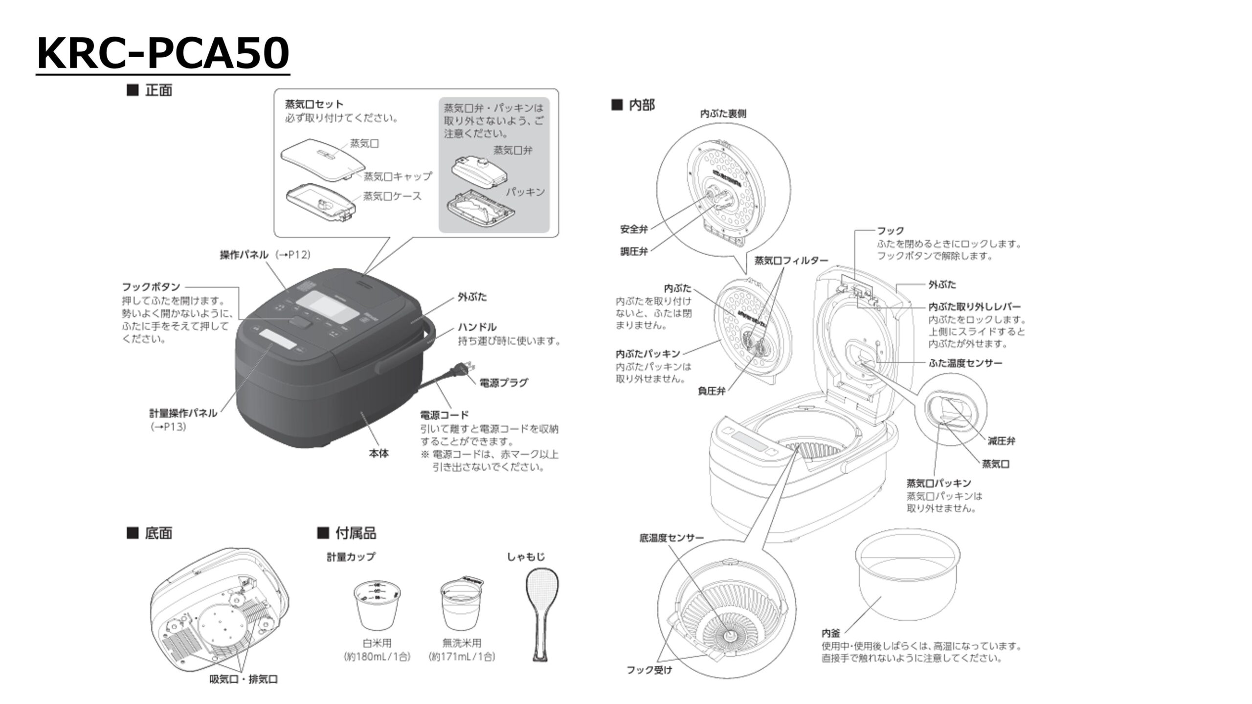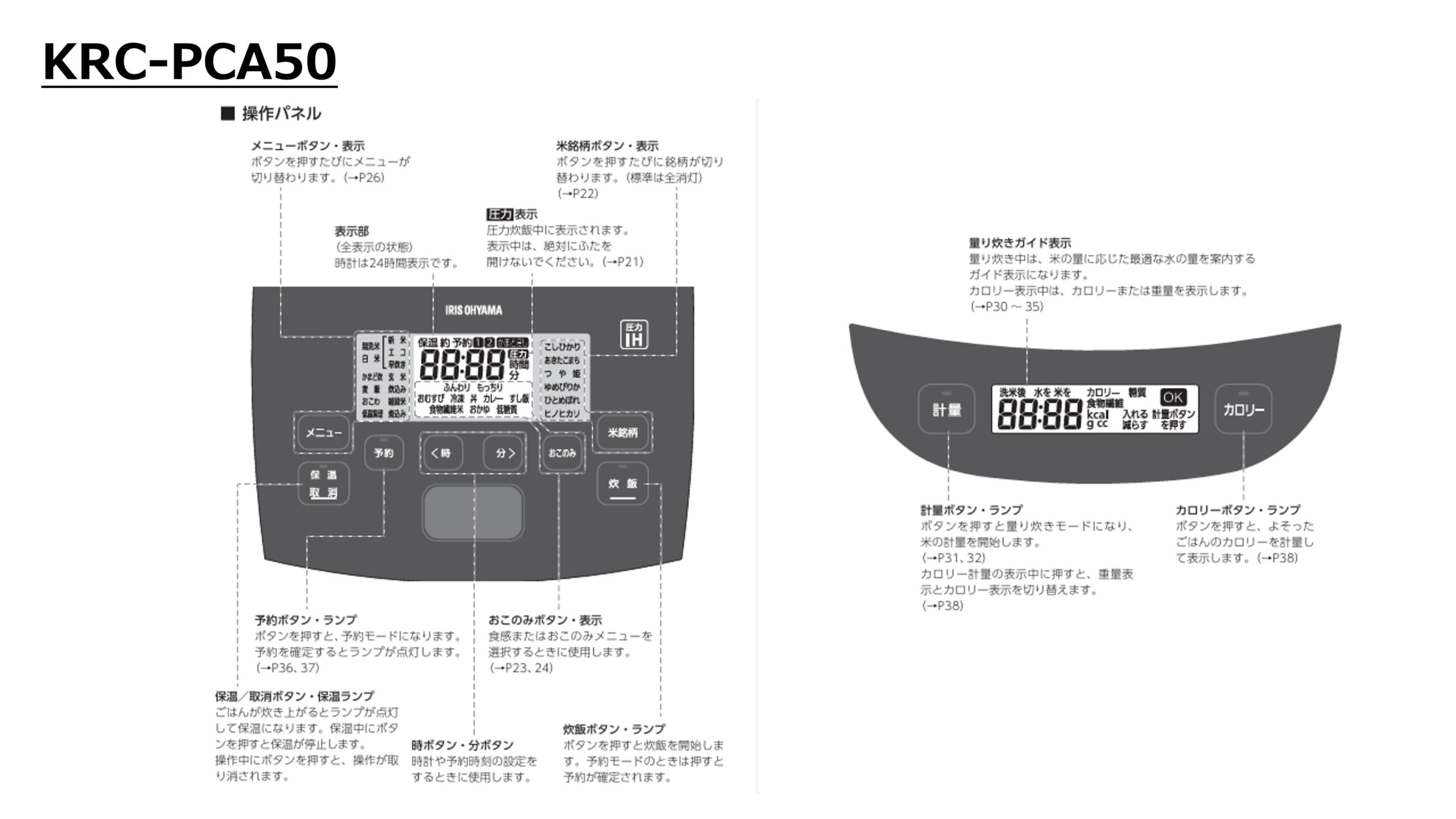 - 機能面 KRC-PCA50:量り炊き・職人炊き分け・低温調理あり、RC-PGA50:自動調理31種・温度調理・お手入れモードあり