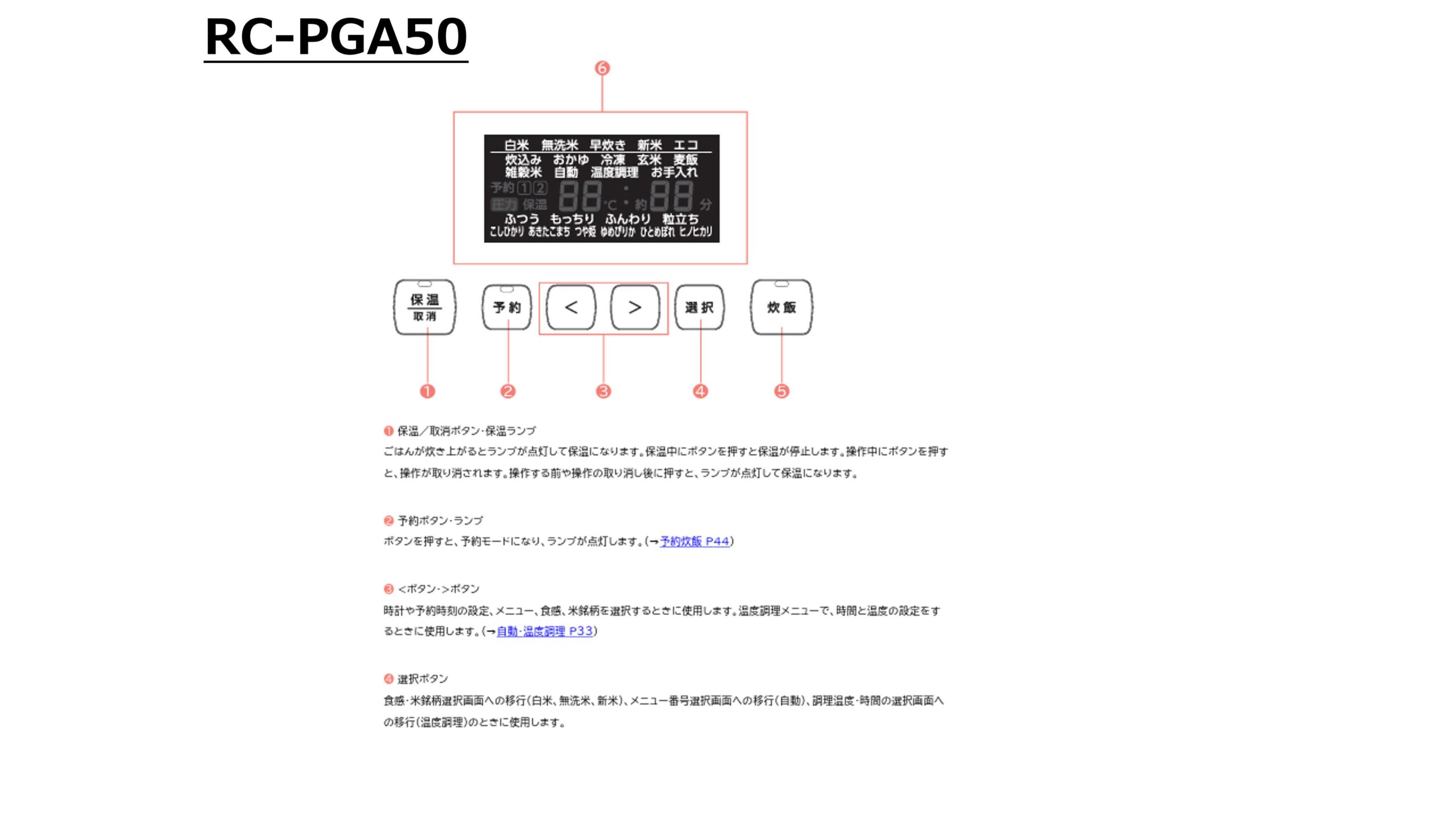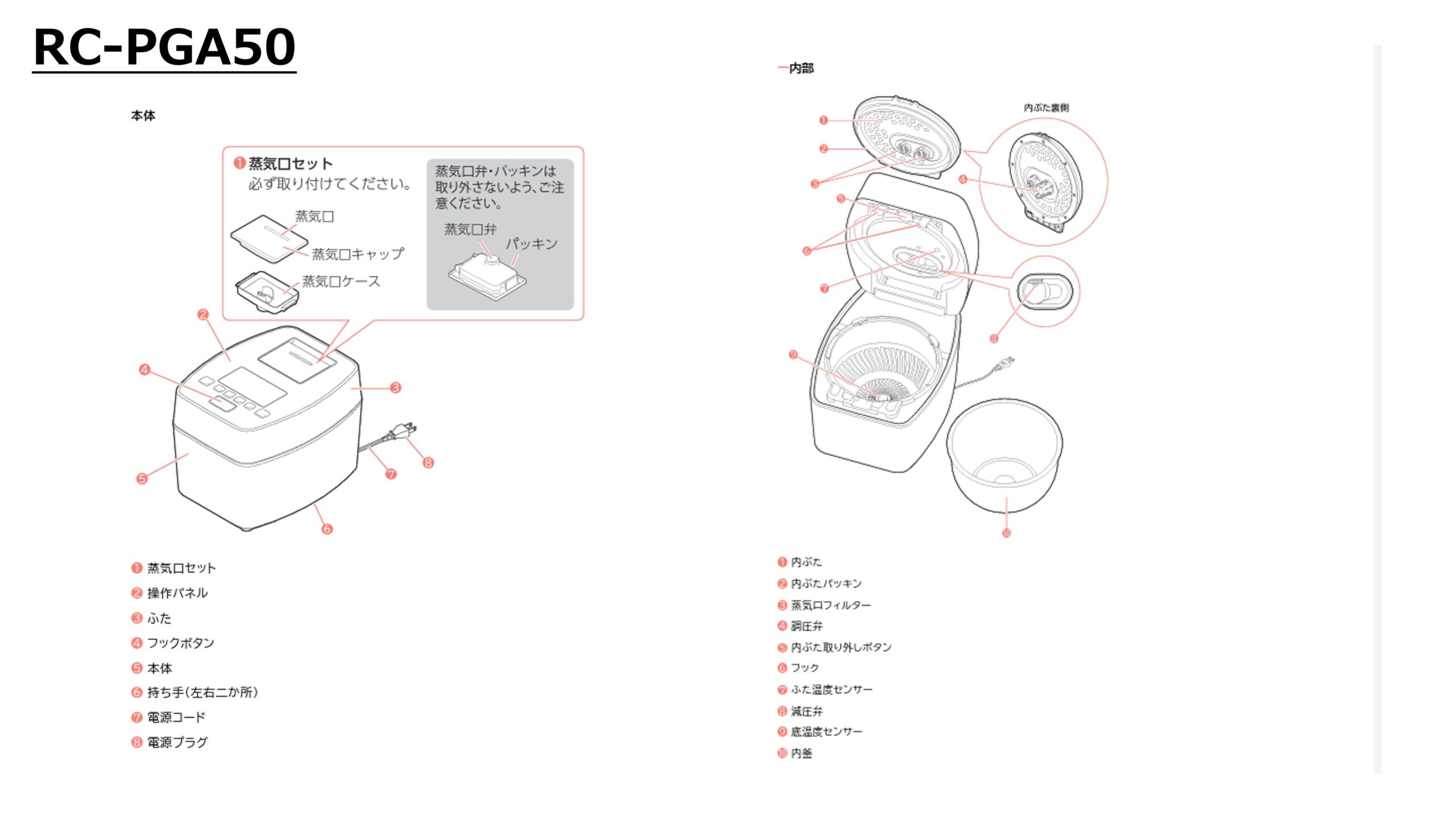 - 加熱方式 KRC-PCA50:技炎かまど炊き、RC-PGA50:圧力IH式