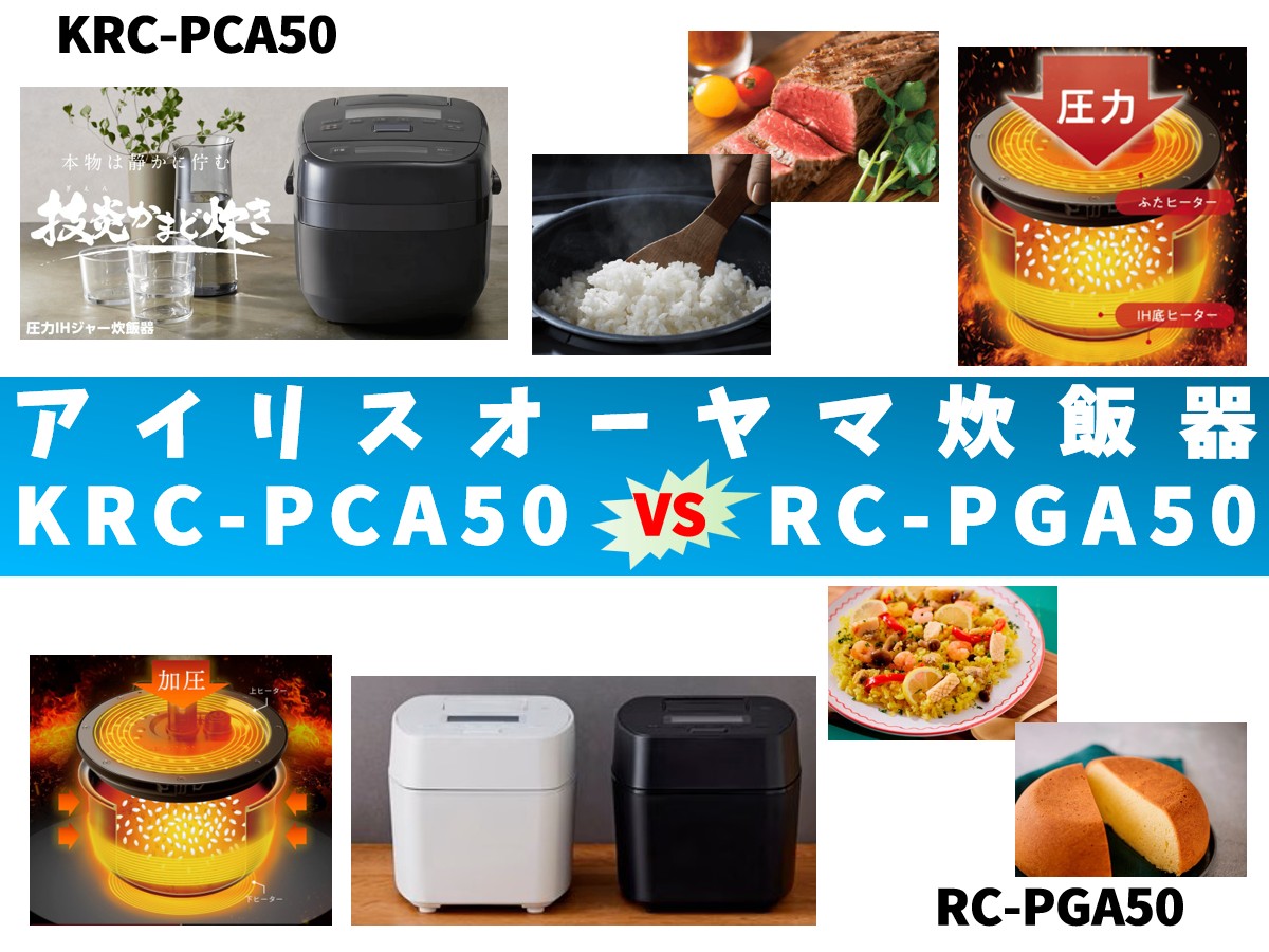 - 機能面 KRC-PCA50:量り炊き・職人炊き分け・低温調理あり、RC-PGA50:自動調理31種・温度調理・お手入れモードあり
