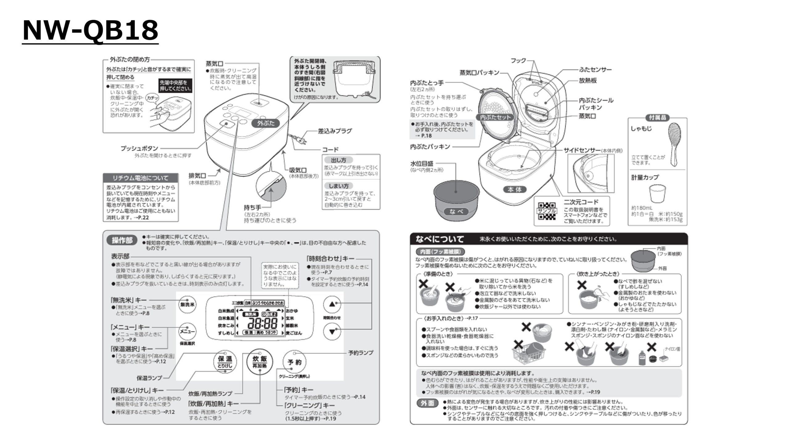 - 炊飯時消費電力量 NW-QB10:148Wh、NW-QB18:185Wh