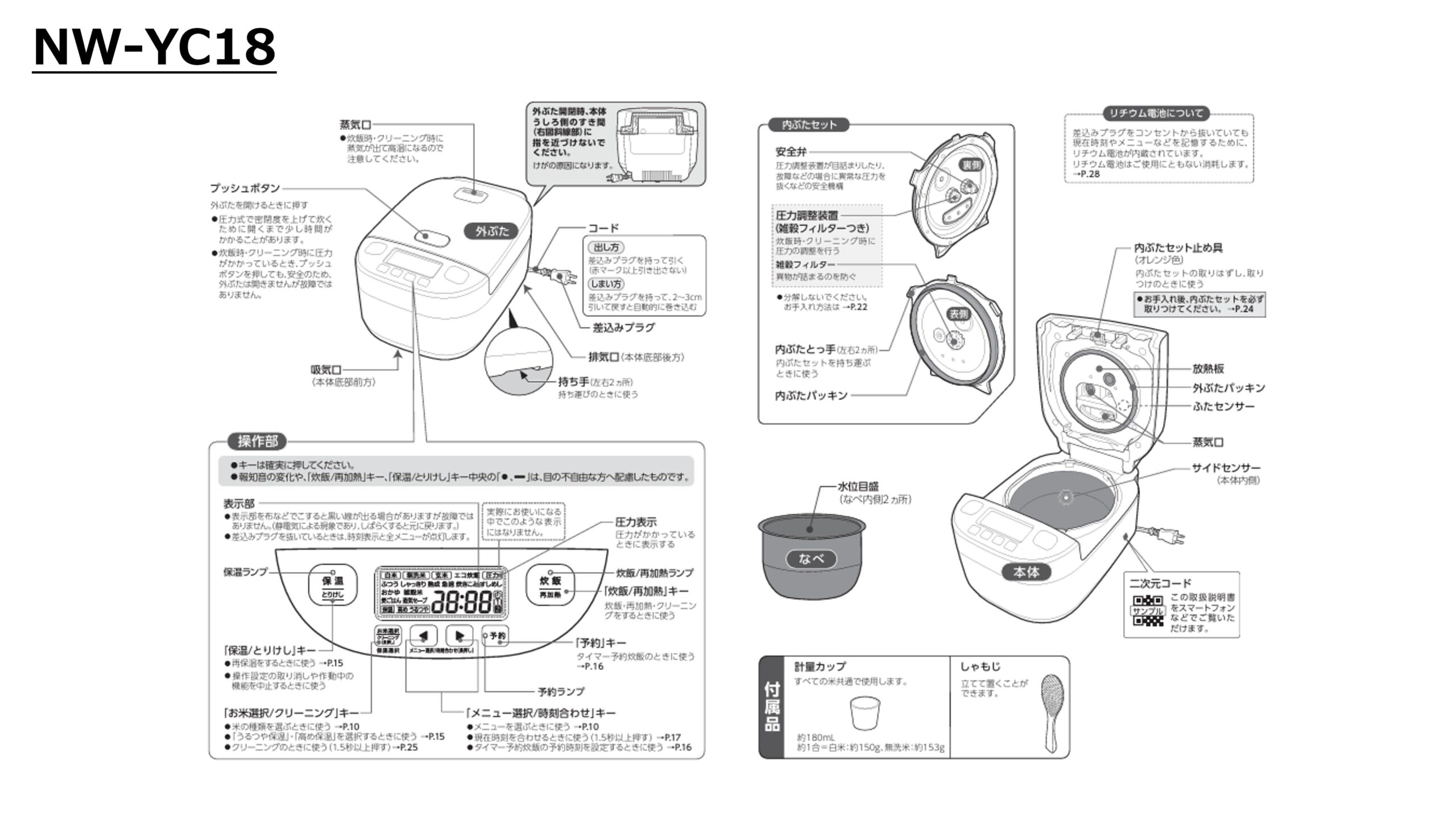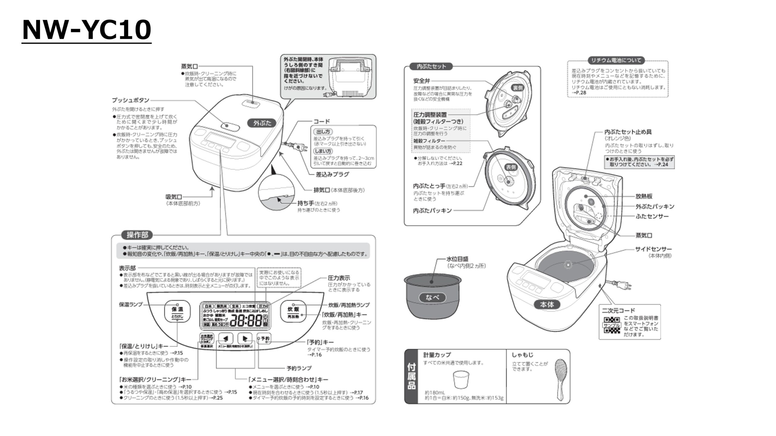 - 炊飯時消費電力量 NW-YC10:140Wh、NW-YC18:180Wh