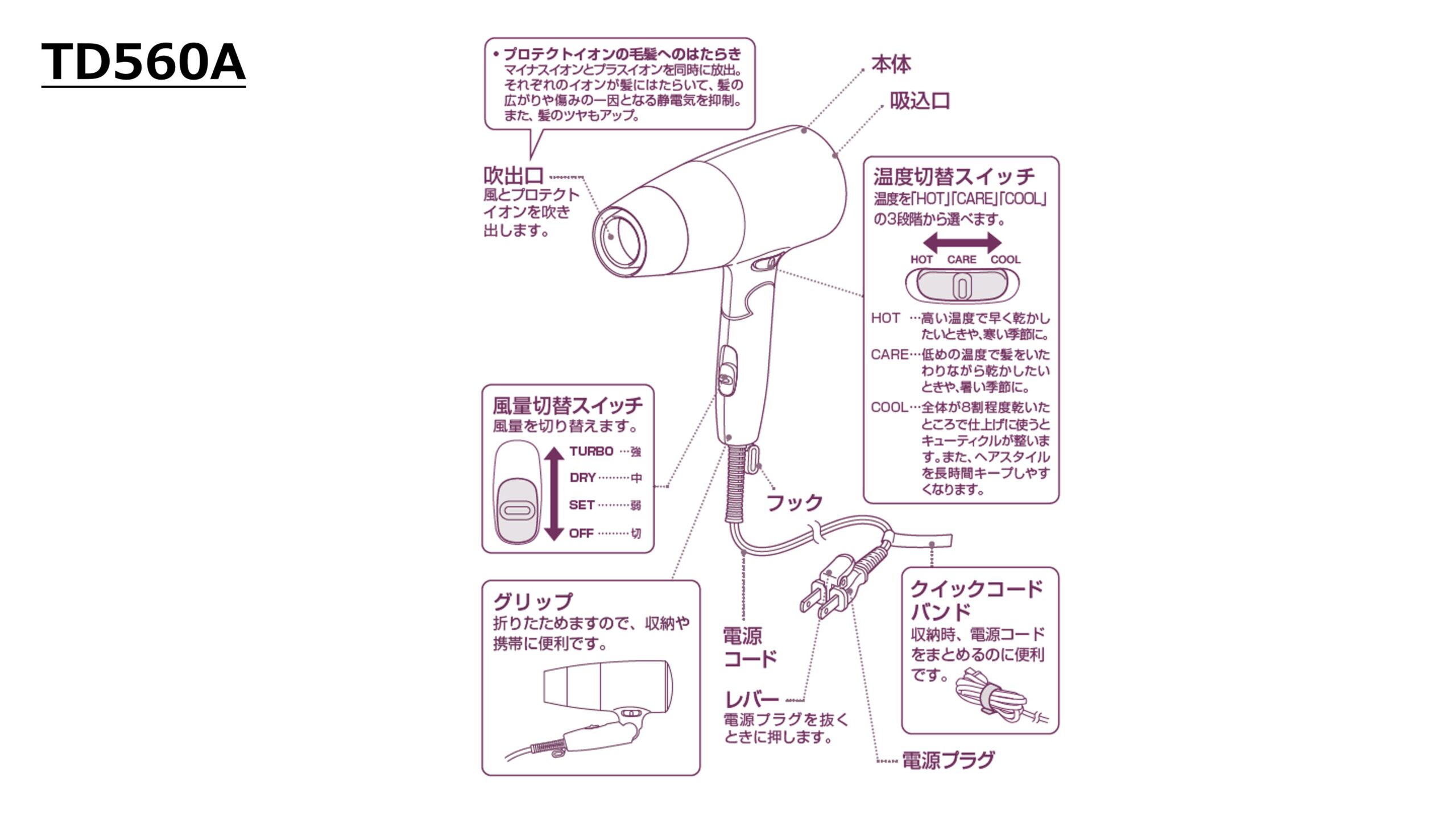- 機能 TD560A:CAREモード・速乾フード、TD570A:SET・クールショット