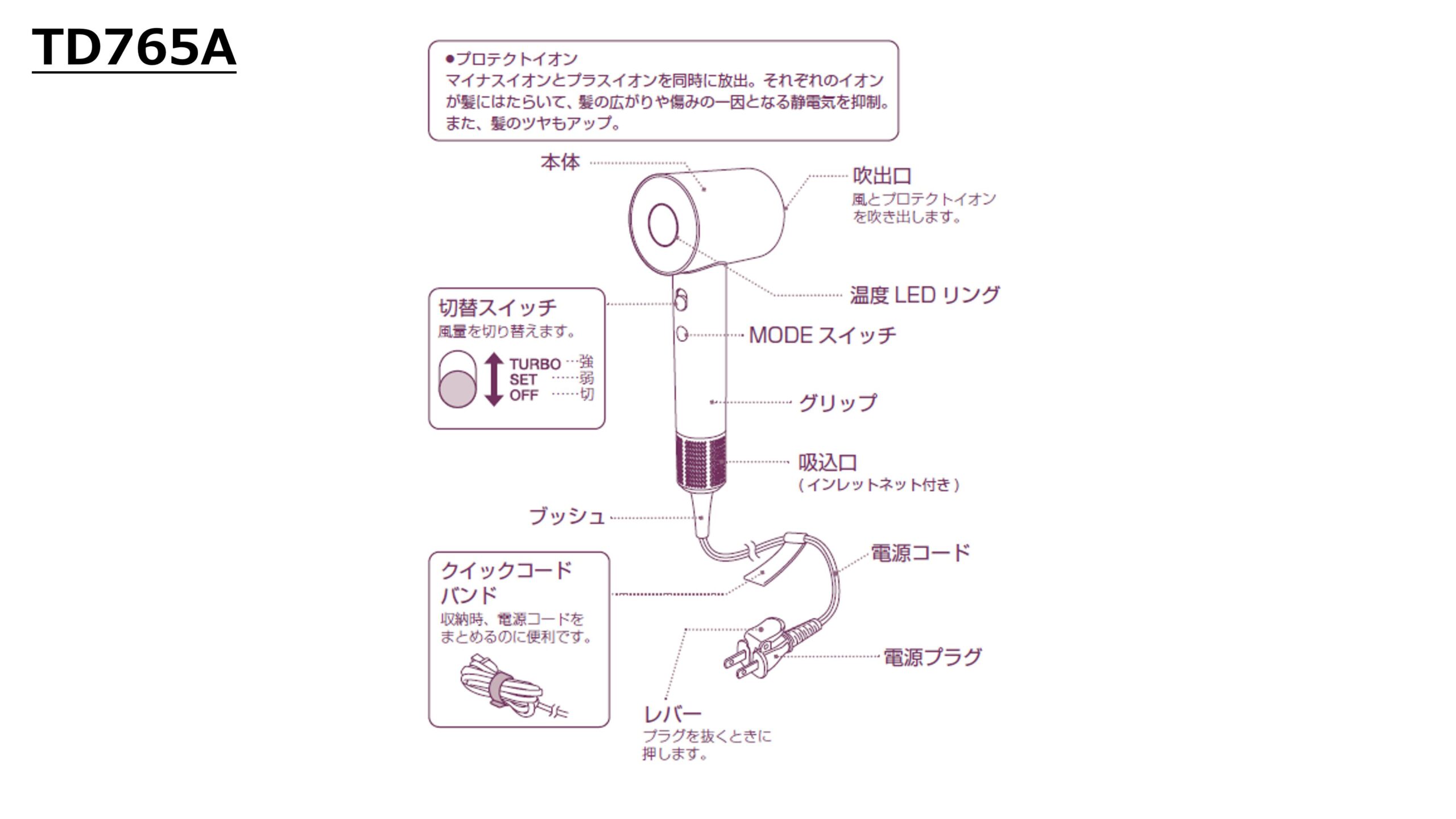 - 搭載イオン TD760A:マイナスイオン、TD765A:プロテクトイオン